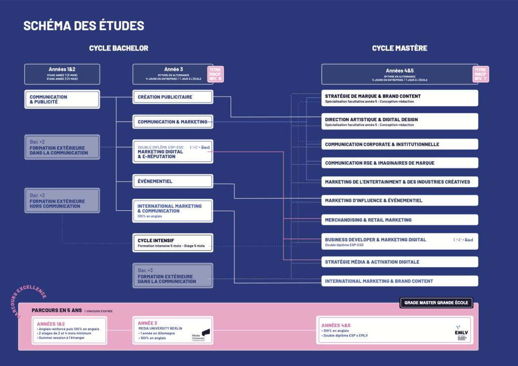 Créé avec l’EMLV (École de Management Léonard-de-Vinci), ce programme Grande École en 5 ans forme des communicants capables de manager, innover et penser à l’international. Tu y développes une double compétence communication–management, mêlant stratégie de marque, data, leadership et vision business. Summer Session à l’étranger, semestre à Berlin et 5ᵉ année 100 % anglophone, l’objectif c’est de devenir un profil complet, capable de piloter des marques, des équipes et des projets à grande échelle.
